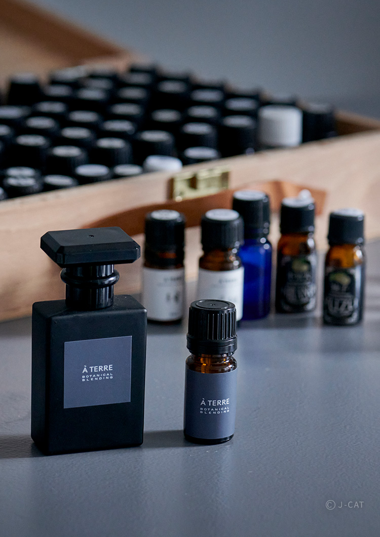 Naho Kawano, the owner and founder of À TERRE, hails from the apparel industry. She became fascinated with aromas on a procurement trip abroad and immediately found herself drawn into the world of scents. She then set about building her credentials, gaining knowledge and skills in essential oil formulation, aroma space design, aromatherapy for mental health, and so on. She also served as a director of the Aroma Environment Association of Japan (AEAJ). “Aromatherapy is a world of never-ending learning. I think that it would be difficult to completely understand the natural world even if you spent your whole life studying it, but that’s what makes it so fascinating. It truly is a deep world,” she says.