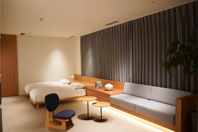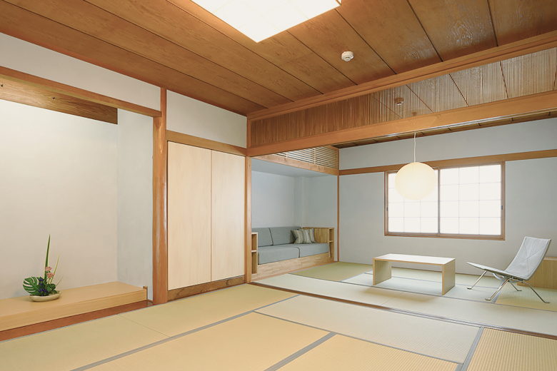 The first-floor master bedroom, adapted from an original tatami room, offers a rare balance of heritage and comfort. It preserves the atmosphere of a traditional Japanese family space while incorporating bedding suited to contemporary travelers. This room allows guests to sleep surrounded by authentic touches of Takamatsu such as wooden fixtures, tatami straw mats, and Japanese garden views, all in complete comfort. Ultimately, the room embodies the villa's guiding philosophy of providing access to regional heritage in luxury and privacy.