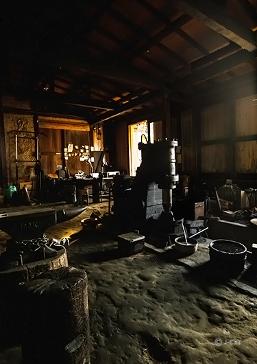 To be able to properly check the condition of the heated iron, it is necessary for this process to take place in complete darkness, so all of the workshop's doors will be closed. The contrast between the pitch-black darkness of the workshop and the flaming sparks is an impressive sight to behold; the sparks that seem to dance in the darkness are mesmerizingly beautiful.