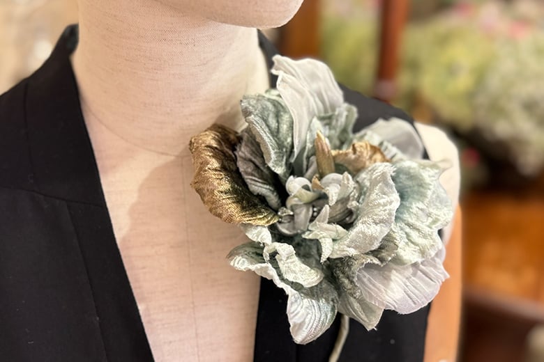 You can take your completed fabric flower home the same day. Use it as a stylish interior piece or opt to turn it into a corsage or hair accessory by adding a brooch pin or comb. Nakamura will adjust the stem's length and angle according to your preferences. Whether deciding where to display it or which outfit to match it with, part of the fun is thinking it through.