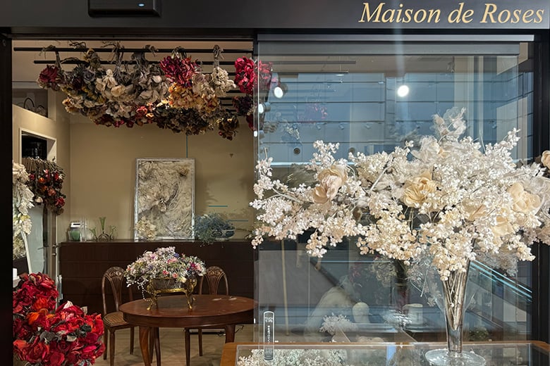 Atelier Roses is the workshop of couture flower artisan Mutsuko Nakamura. She creates a variety of items using "dyed flowers," such as wedding dresses, headpieces, bouquets, corsages, accessories, and interior decor. Nakamura offers classes for beginners and advanced courses. With many international followers on Instagram, her workshops attract a steady stream of guests from abroad seeking to learn her techniques.