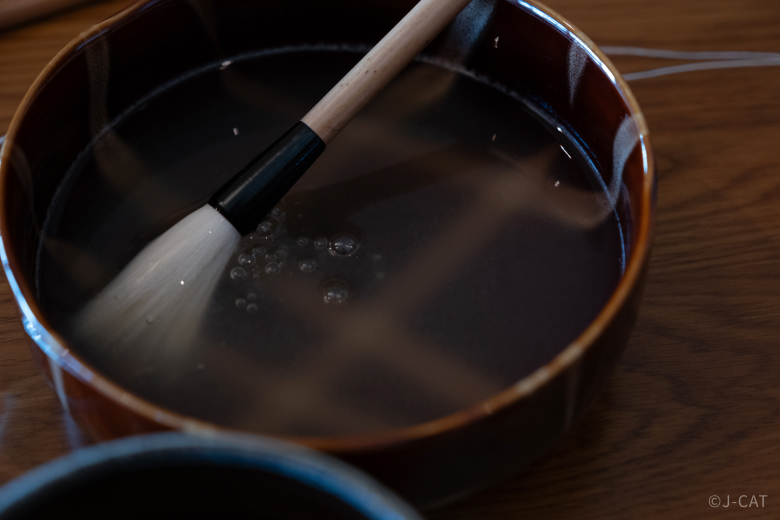 The final step in brush-making is norigatame, sealing brush hairs with glue. This is one of the steps that you will have the opportunity to try in the showroom. As the brush is bound with thread, it is sealed and hardened with natural glue made from seaweed. If you book the optional add-on, you will use higher-quality hairs for this portion of the experience.