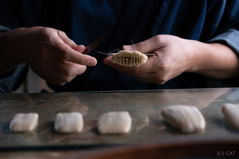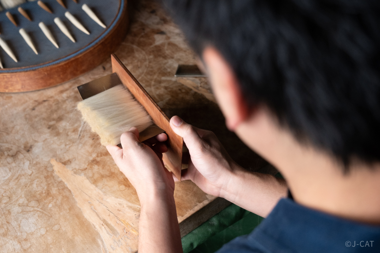 Meanwhile, yakijime is an advanced technique in which the base of the hair bundle is heated to harden it. This stabilizes the shape of the brush head, setting the foundation for the brush to become a tool that will last a lifetime.