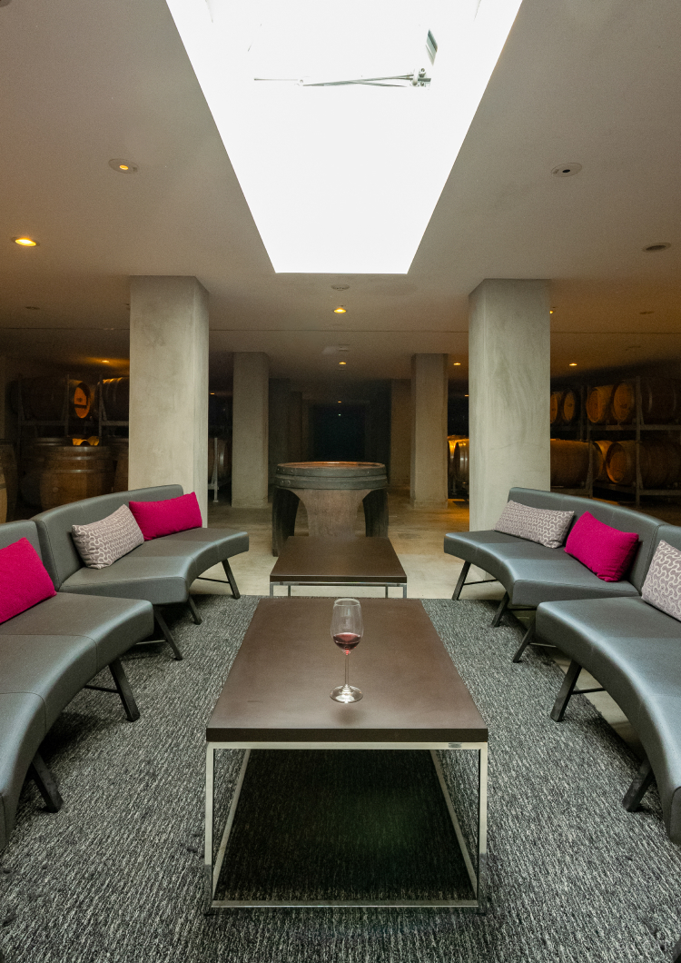 After the tour, you will step into the Ortus Room, a quiet, salon-style space tucked away in the underground cellar. Designed for an intimate tasting experience, this elegant room is softly lit, with cushioned grey seating subtly evoking red and white wine. In front of you, wooden barrels cradle aging vintages, and the scent of wine lingers gently in the air.