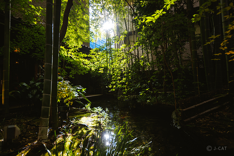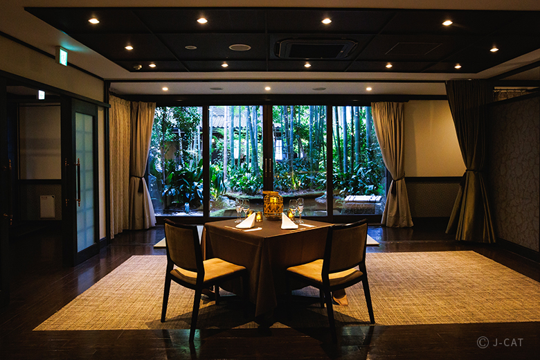 Fortune Garden Kyoto is a remarkable restaurant space. Its structure, originally built as the headquarters of the Shimadzu Corporation in 1927, is a masterpiece of early modern art deco architecture designed by Goichi Takeda. It has since been renovated with the addition of a traditional bamboo grove and koi pond in its courtyard garden area to complete its transition from private corporate headquarters to accessible fine dining bistro and event venue.