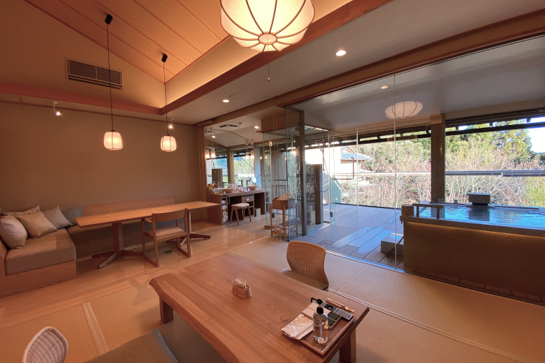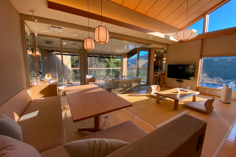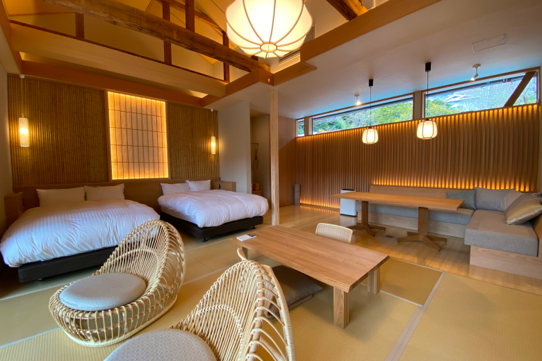 The second-floor guest rooms provide a truly private retreat, with the option of in-room dining available. Large windows invite the natural scenery indoors, complementing the curated designer furniture and elegant decor. Combined with the gentle, soothing waters of Yugawara, every moment promises a uniquely personal and timeless experience.