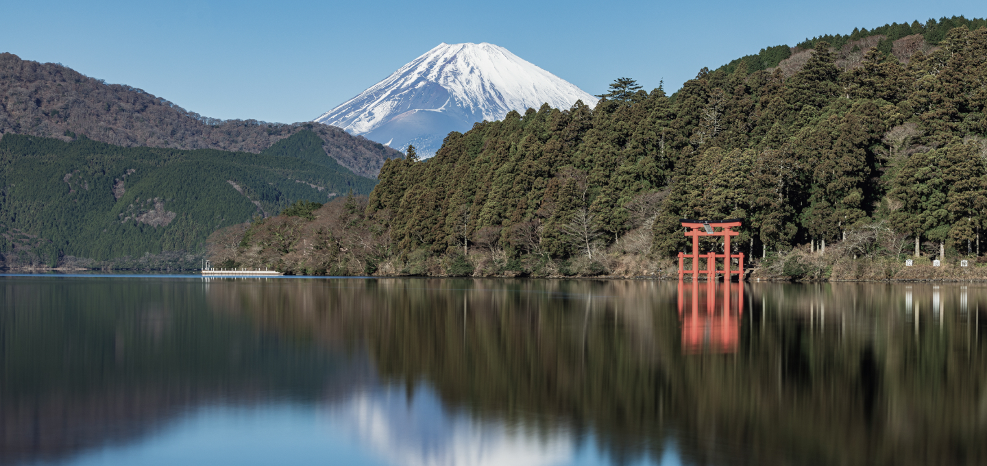 Lake Ashinoko is a long slender crater lake that rests serenely in a saddle between the mountains of the Hakone highlands. Surrounded by lush verdant forests with walking paths and lakeside temples and shrines, the lake offers some of the most picturesque views in Japan. On clear days, Mount Fuji is clearly visible over the northwest end of the lake, beautiful in any season but particularly in winter or spring with its pure white snowcap.
