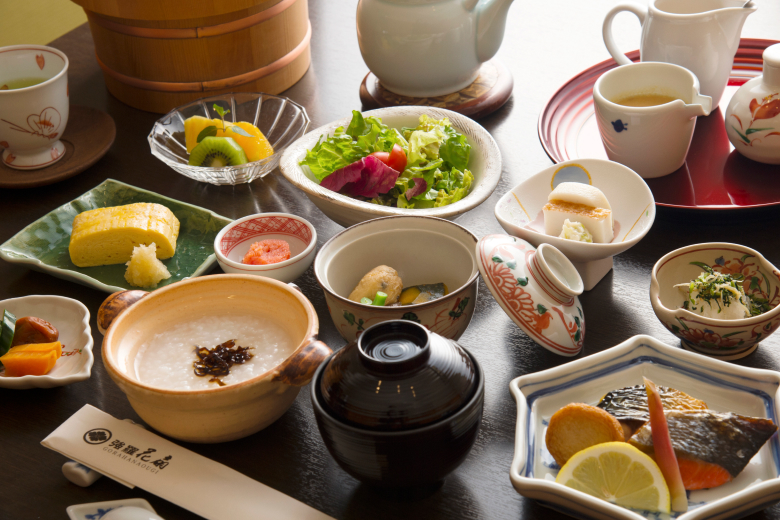 A Japanese-style breakfast is served at Gora Hanaougi, based on steamed rice, miso soup, grilled fish, and seasonal pickles. The meal features a balanced assortment of nutritious hot and chilled dishes, including locally-sourced vegetables and seafood from nearby Odawara. Breakfast generally includes steamed rice, miso soup, seasonal pickles, grilled fish and okayu (rice porridge), as well as an assortment of fresh fruit and vegetables.