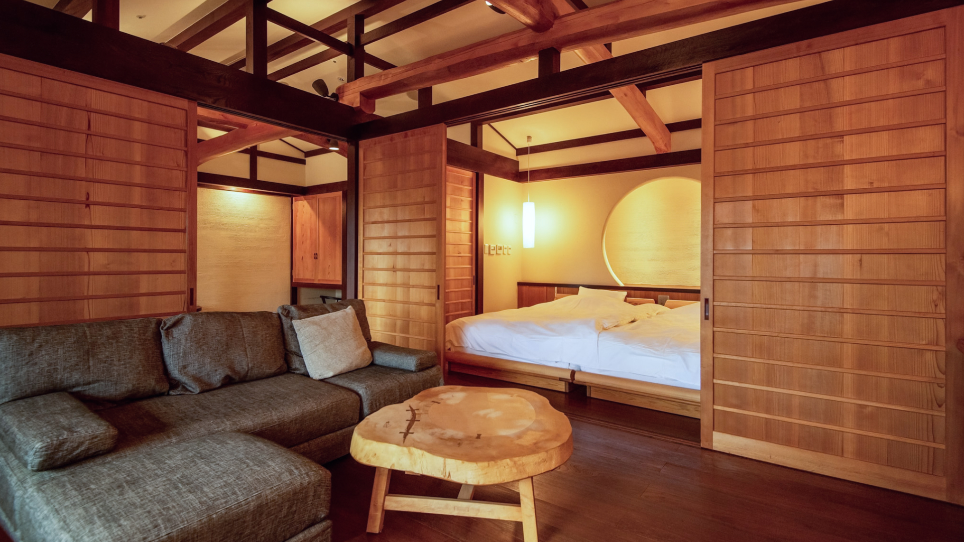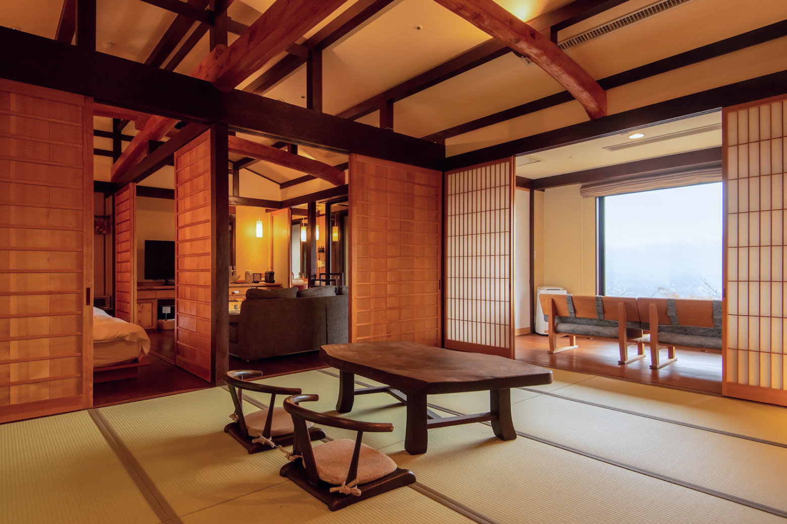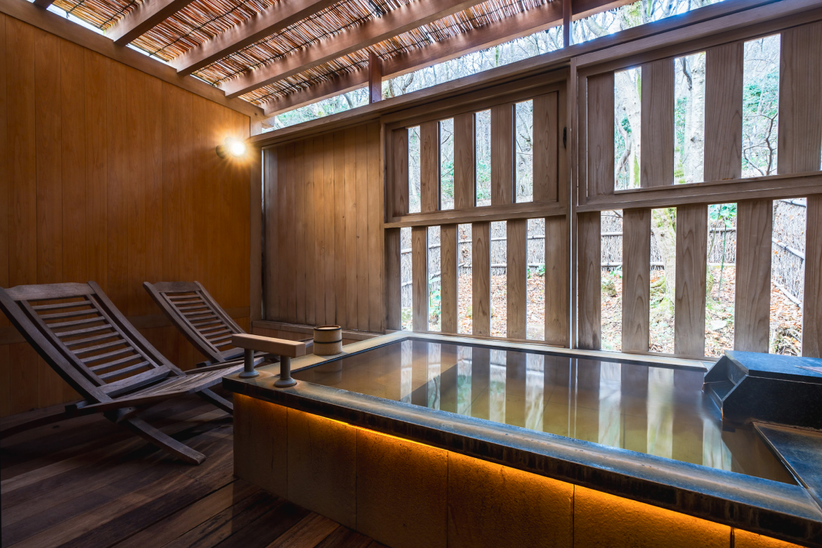 Located on the second floor, Japanese-style rooms provide an authentic local experience, with futons prepared on the tatami-mat floors each night. By day, futons are removed so that guests can relax on low chairs on the tatami and admire the view, which can also be enjoyed from the room’s open-air onsen bath.