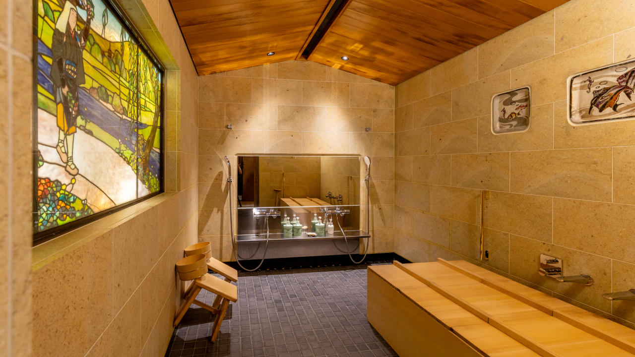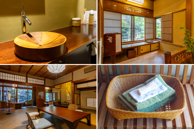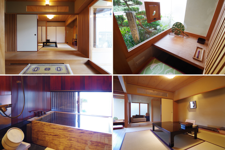 The room includes a private ofuro bath crafted from high-quality Japanese umbrella pine. Filled with soft underground spring water, the bath provides a calming bathing experience.