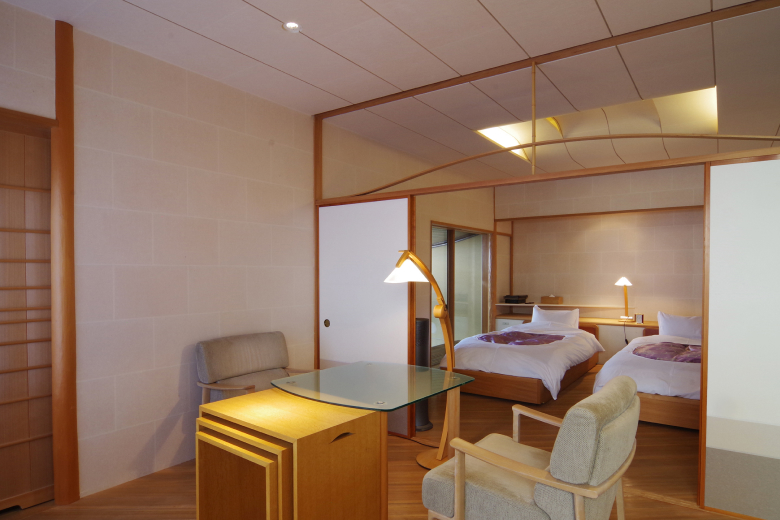 A guest room with an authentic sense of history. From the engawa veranda, guests can gaze upon mube vines climbing gracefully along the garden wall, as well as the trees that fill the courtyard below.