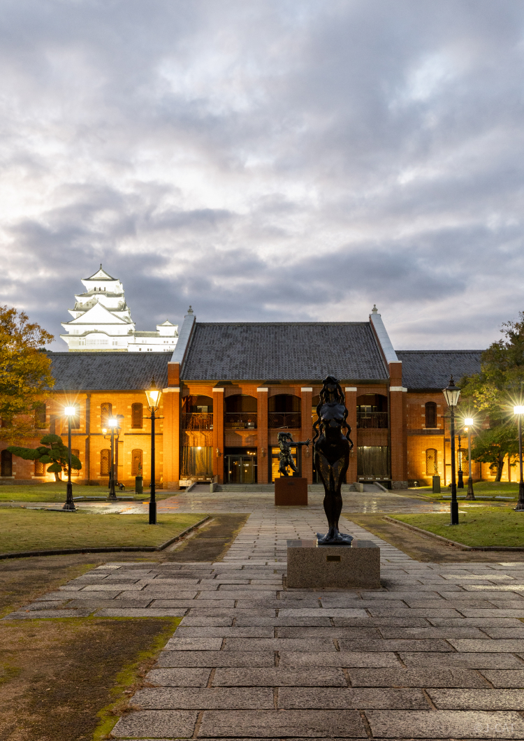 The red-brick building and garden, set against the towering backdrop of Himeji Castle, create a scene like a painting. Stroll through the garden to admire sculptures and other artworks on display.
