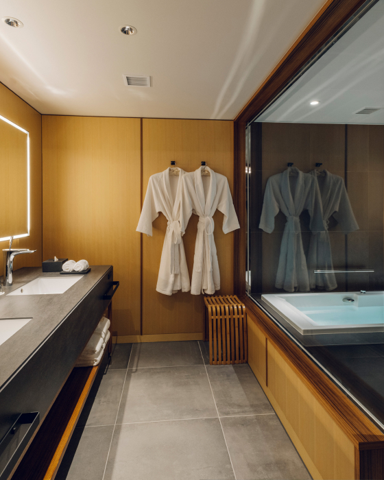 Yoshiaki Nakamura of the Nakamura Sotoji Construction Company compares entering the rooms of The Hiramatsu Kyoto to “unwinding a picture scroll.” As you move from the entrance into the bedroom and the living area, separated by a wood and metal lattice, different aspects of the space unfold before your eyes. Sleek Danish furniture complements the subtle warmth of traditional Japanese style. With this Wabunka plan, you will be staying in the deluxe premier room, which includes two semi-double beds. The bathtub is equipped with powerful jets to soothe your muscles after a long day.
