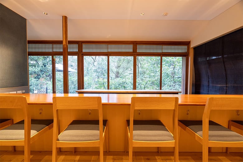 Zikido Ichifune’s long counter offers excellent views of the garden