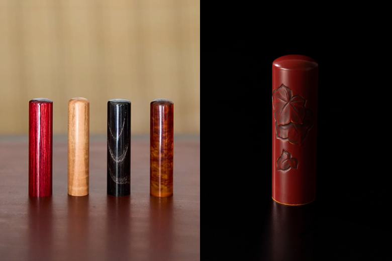 In addition to boxwood, other options include monarch birch, cherrywood, natural black water buffalo horn, amber and Kamakura-bori wood (prices vary by material). Kamakura-bori seals are hand-carved in collaboration with skilled artisans and finished with layers of natural urushi lacquer, resulting in a warm, durable piece that grows more beautiful with age. All of Kamakura Hanko’s stamp materials are brand products from Koshu, Japan’s leading personal seal material production region. Due to being produced from natural materials, each one has its own unique look. Feel free to handle them and get a feel for their color, pattern, weight, and texture to find the one best suited to you.