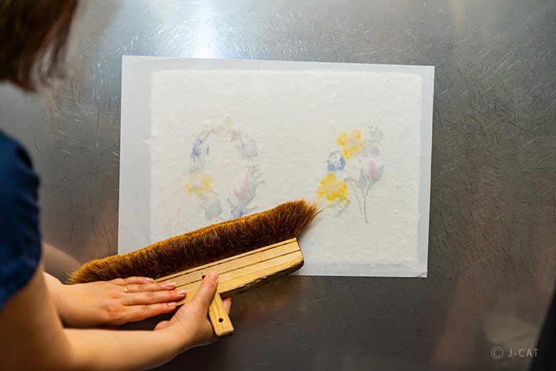 After arranging the pressed flowers, coat them with the prepared washi and a brush. The pressed flowers create raised spots, so it is crucial to properly remove air bubbles here to ensure a beautiful finished product. Next, put the paper through a dehydrator to thoroughly remove all moisture.