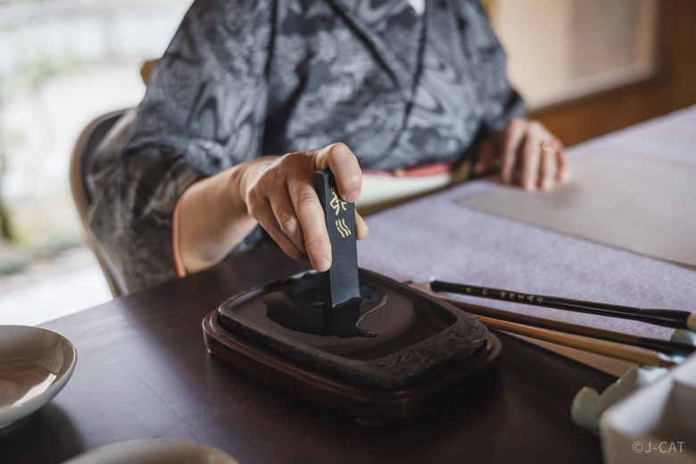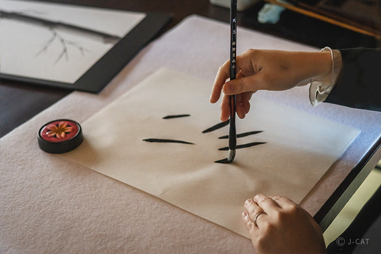 Next comes an essential step: grinding the ink. The faint sound of the ink being ground against the inkstone and its refreshing fragrance will transport you to another place away from the noises of everyday life. Once the ink is ready, you will observe a demonstration by the instructor up close. Afterwards, using practice paper, you’ll do a few test brushstrokes, gradually developing a natural feel for the techniques of ink painting.