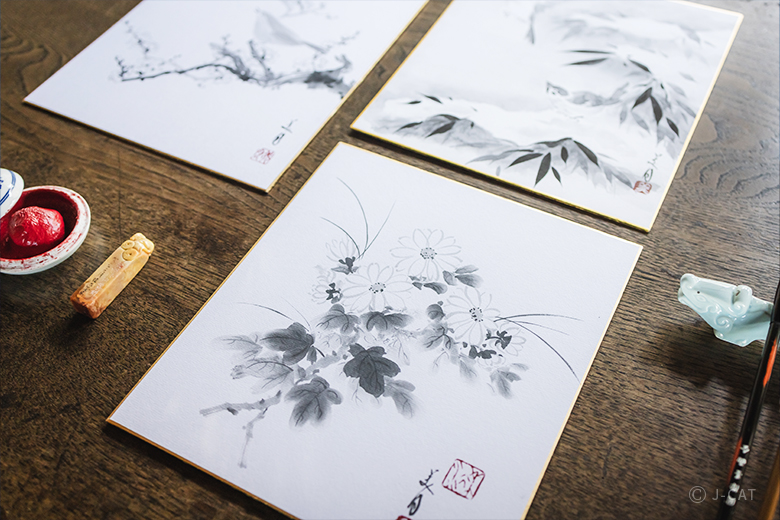 - After grinding your own ink, choose between “bamboo” or “seasonal flowers” for your subject, and paint on a traditional shikishi art board (the finished work is yours to keep)