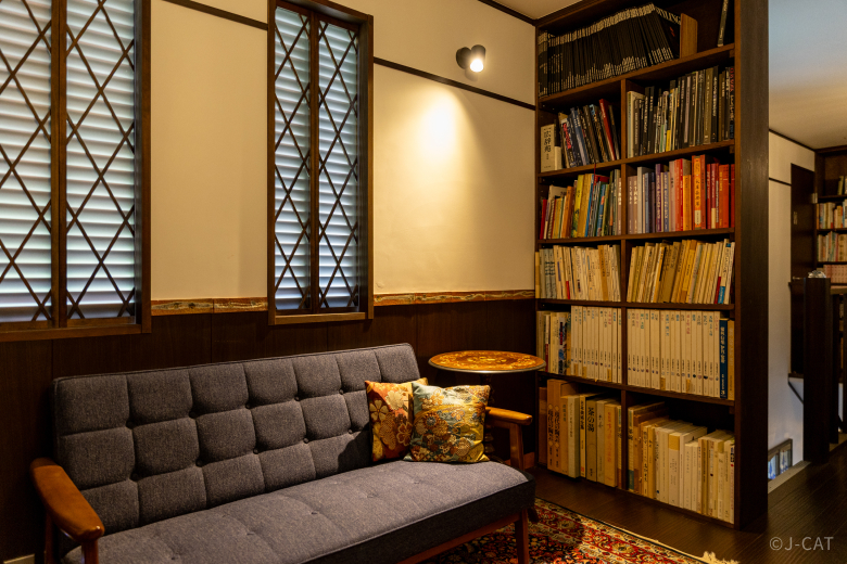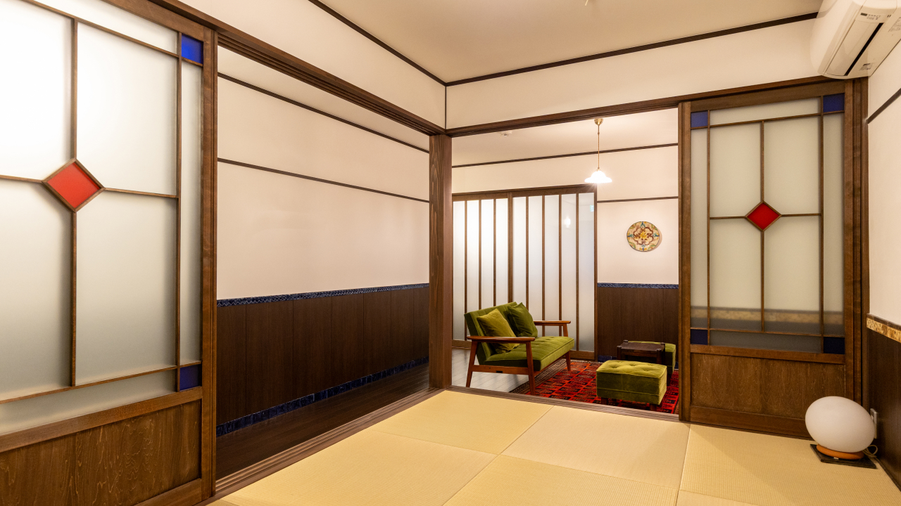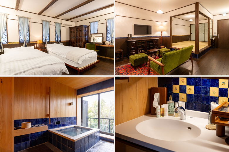 The part of Kochu-an where you will stay is furnished to ensure a comfortable time while retaining the serene ambiance of a traditional Japanese house. Its design is a harmonious blend of Japanese and Western styles, seamlessly connecting a tatami room, a living room with a sofa, and a bedroom — all with a sense of cohesion. With Shigaraki-ware tiles created by Rakunyu Ceramic Studio adorning the walls, this space was thoughtfully designed for guests to spend every moment appreciating the beauty of Shigaraki ware.