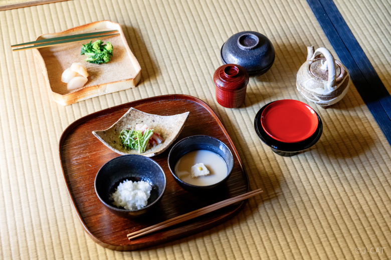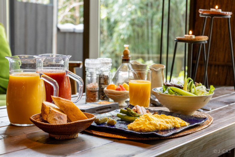 For breakfast, indulge in bread from a popular local bakery served with premium butter, homemade ham from a renowned French restaurant in Kyoto, and eggs prepared to your liking: scrambled, fried, or omelet-style. Also on the menu are fresh salad, fruits, and pickles, ensuring that your meal is not only filling and delicious, but also nutritionally balanced. These dishes will all be served on beautiful tableware selected to complement the food.