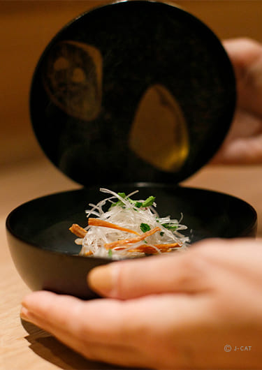 The presentation of the dish is meticulously designed to exude beauty, with thin slices artfully arranged to allow glimpses of the captivating paintings on the bowl to shine through. The addition of maki-e lacquer art depicting Genjiko (incense) and Kaiawase (shells) on the bowls also add a touch of color to the dishes. The final result is a culinary masterpiece that delights not only the palate and sense of smell but also the eyes. Each dish is a unique and unparalleled experience, born from engaging conversations with the host. Immerse yourself in this extraordinary journey, relishing the dishes while sharpening all five senses.