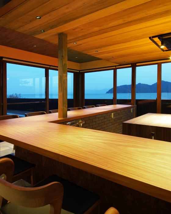 The private dining room carries the polished atmosphere of an open kitchen in a fine restaurant. Your personal chef prepares each dish in front of you, creating a lively sense of anticipation as you enjoy a range of inventive courses. The expansive view of the Sea of Japan through the large windows brings an added layer of elegance to the experience.