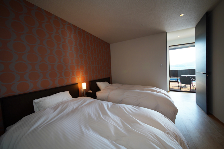 The two bedrooms are equipped with four single beds, accommodating up to six guests. Both rooms offer views of the courtyard and terrace overlooking the ocean. The meticulous design, reflecting a distinctly Japanese aesthetic, evokes the beauty of nature and the changing seasons.