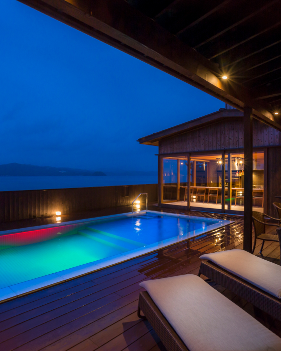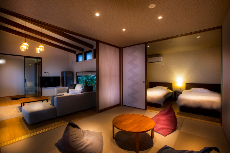 The spacious 182-square-meter villa includes a first floor with a living room, two Japanese-style rooms, two bedrooms, and a dining room. The second floor features a bathroom with two natural hot springs. In summer, alternate between the private terrace pool and the hot springs for a luxurious experience.