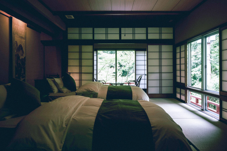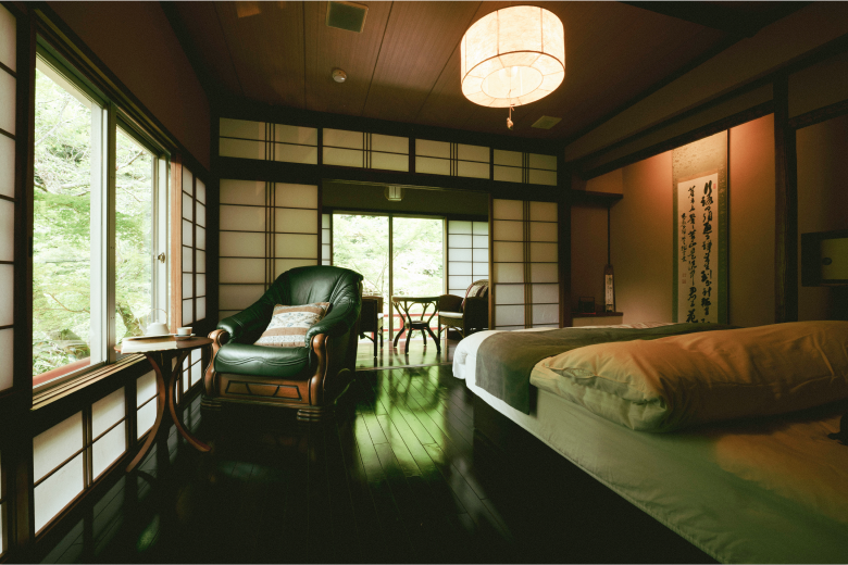 Jitoku-no-Ma retains the classic features of traditional ryokan design such as sliding shoji doors and tatami-mat floors, alongside two single beds and other examples of Western-style furniture. The river runs close by and the windows look out through the leaves of the nearby trees into the deeper reaches of the forest. The room includes a private bath.
