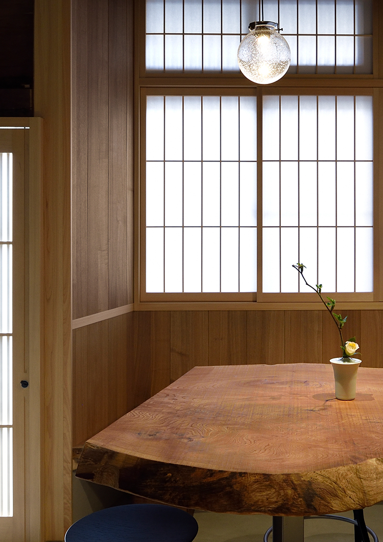 While maintaining its machiya townhouse elegance and traditional deep narrow layout, the structure of Guest House MICaSA has been reborn as a fully modern space, drawing on a honeyed color palette of interior design and furniture pieces lovingly curated by the proprietress. Just inside the front door, its entryway counter draws the eye: a single piece of zelkova wood set above an earthen floor for a sense of tasteful, naturalistic nostalgia.
