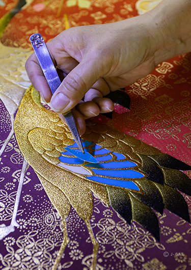 ・Observe five key processes out of nearly 20 involved in kimono making, including a demonstration of applying gold glaze and mother-of-pearl inlay decoration