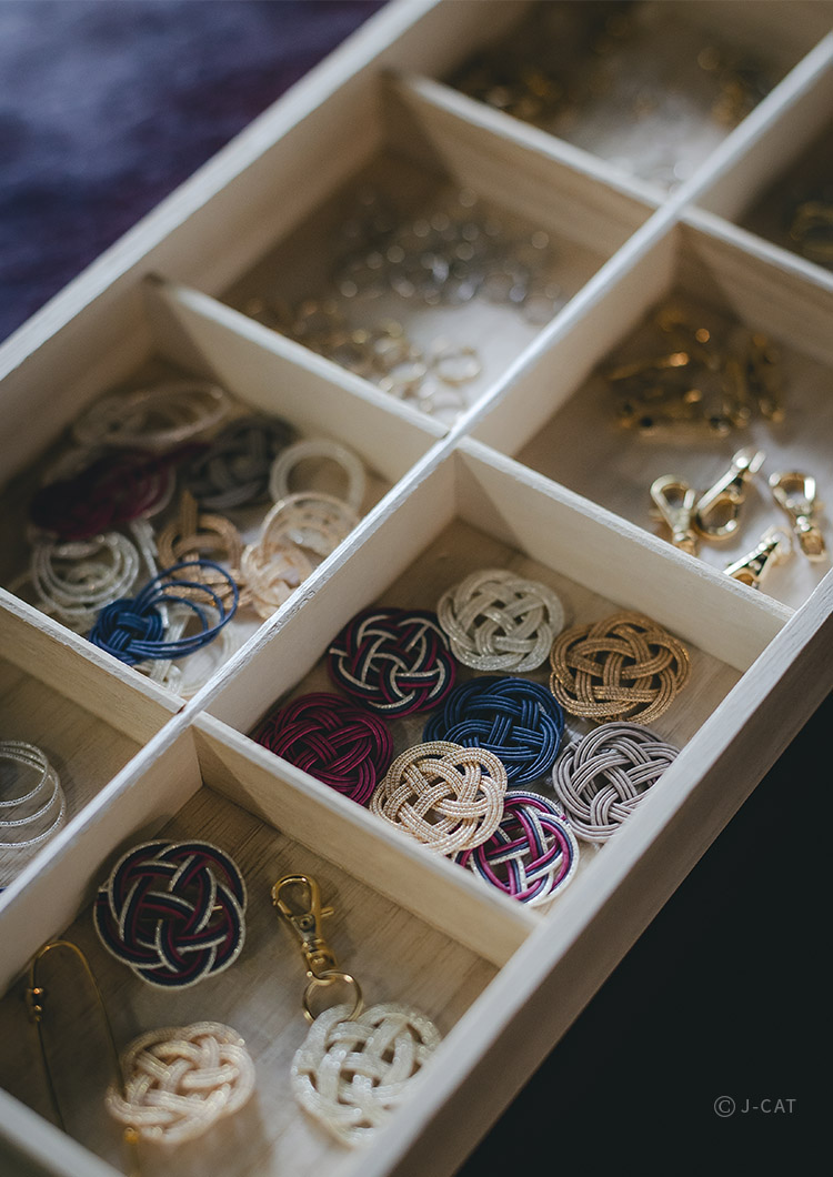Once you've chosen the item you want to create, you’ll pick the mizuhiki colors. Tanaka has handpicked three stunning shades: gold, silver, and pearl white, along with three traditional Japanese colors: indigo, plum, and walnut. Put together your own combinations with your favorite colors — the possibilities for unique creations are endless.