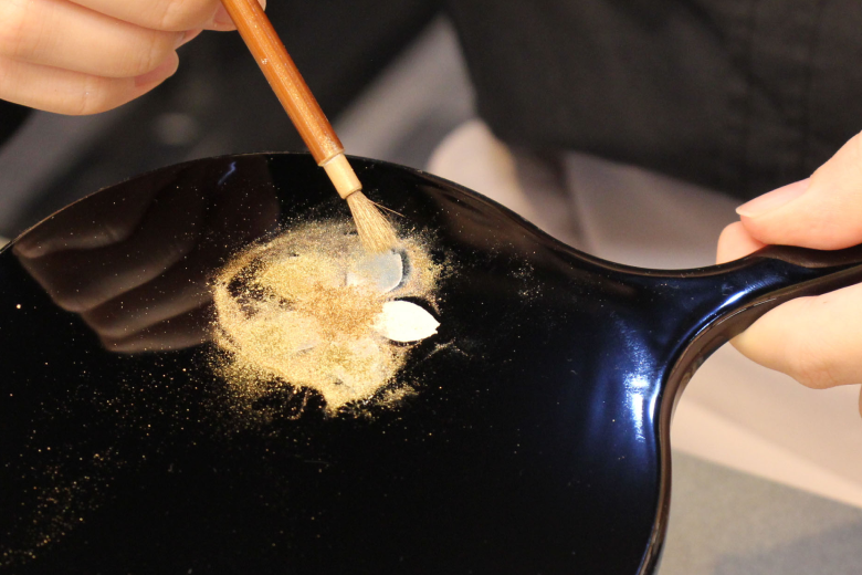 Hira maki-e is the principal form of maki-e, in which a design is drawn with lacquer as an adhesive base and then pigment powders including metallics such as silver and gold are dusted on for color and depth (the word “maki-e” literally means “sprinkled picture”). Lacquer can be difficult to handle for beginners, due to its tendency to cause irritation when coming into contact with exposed skin. That’s why this experience uses cashew paint instead, which beginners can handle without fear of ending up with a rash.