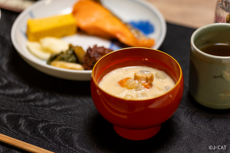 The meal includes white rice, pickles, grilled fish, and kasujiru – a regional soup made with sake lees, prepared by the brewery owner’s wife. Sake lees are a nutritious byproduct of brewing, gently warming the body from within. This is a breakfast that nourishes the body after the demands of brewing.