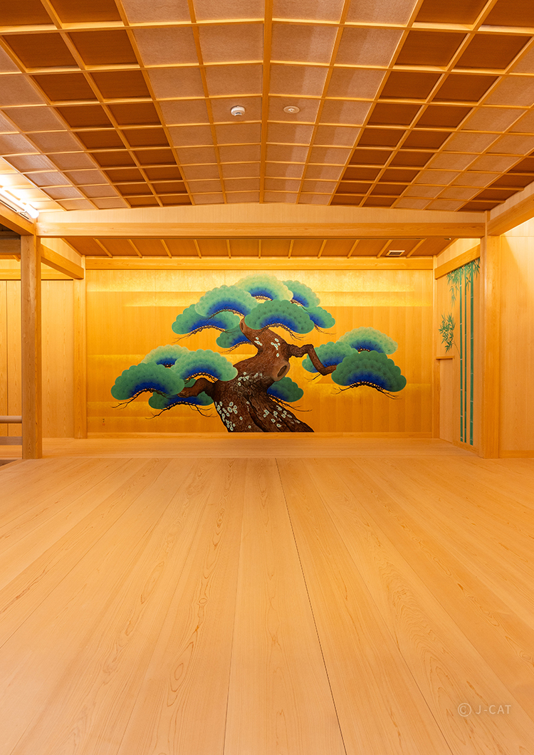 The dignified noh theater, complete with the traditional pine tree backdrop