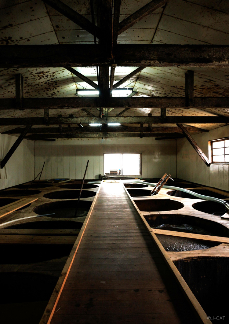 Koji (Aspergillus oryzae) is produced by mixing steamed soybeans with roasted and crushed wheat, growing over them as a mold for a period of roughly three days. Depending on the timing of your visit, you may even get to peek inside the kojimuro room where this growing is done. But because this is a delicate fungus, no one is allowed into the room if they have eaten fermented natto soybeans in the day prior to the tour, in order to avoid contaminating the koji. With this fungus, Okamoto produces three varieties of soy sauce: koikuchi (dark), usukuchi (light), and saishikomi (double-brewed).