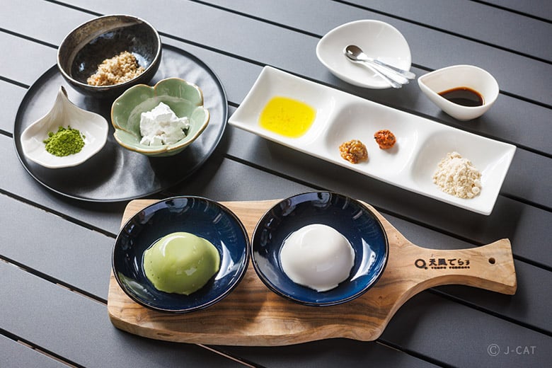 The Wabunka plan offers two types of sesame tofu for a comparative tasting – plain and matcha – with three toppings each. Kinzanji miso (thought to have been brought back from Tang Dynasty China by Kobo Daishi during his travels there), shichimi chili paste made with sansho pepper (a Koyasan specialty), and olive oil with salt. The Kyoto Ippodo Tea flavor is made with matcha powder and has a dessert-like sweetness sprinkled with wasanbon sugar. Enjoy a detailed explanation from Baba on the culture and preparation process of sesame tofu.