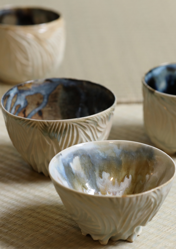 Yamada also works as a potter, producing tea bowls and sake vessels under the brand name Yamasho. Through his ceramics, he pursues the ideal of mu-i shizen (“nature unworked”), or letting things be as they are without intervention. Using several types of glaze and mixing them naturally, Yamada allows a unique beauty to emerge on its own without overly designing or controlling the process. This leaves room for the viewer to form their own interpretative relationships with each piece, and results in utterly one-of-a-kind wares. Enjoy them up close in this experience.
