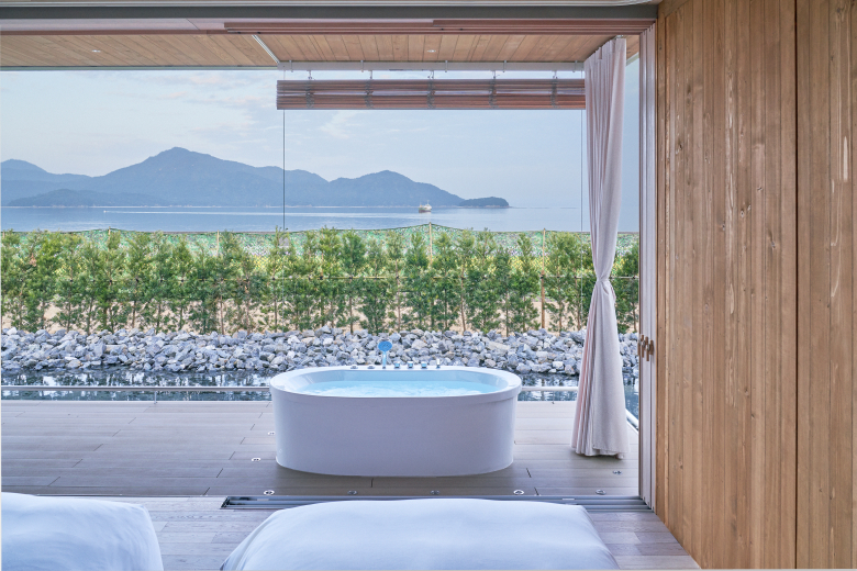 Depending on the villa, features include tatami flooring, hinoki cypress bathtubs, Towada stone baths, and private terraces. This stay experience emphasizes refined luxury, privacy, openness to nature, and an intimate connection to the sea.