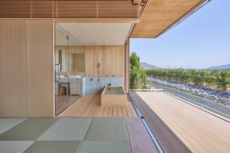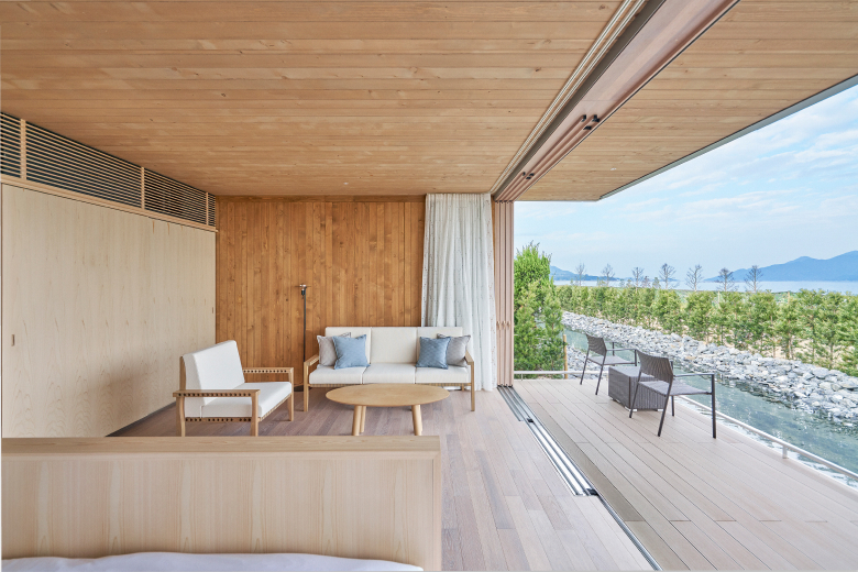 Guests will stay in one of the Kielsteg Houses – Simose’s waterfront villas overlooking both the Seto Inland Sea and a reflecting pool. Constructed using the high-tech, luxurious, and environmentally friendly Austrian wood material known as Kielsteg, each villa offers a refined space with a feeling that is both cozy and expansive, where exquisite architecture frames water and air.