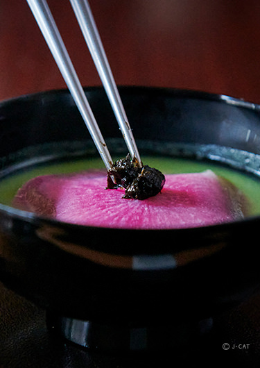 Chef Nomura's culinary philosophy is to constantly explore new cooking methods and ingredients from all over the world. For instance, he uses hassaku, a type of citrus fruit, to create a sherbet-like ice cake called granité, which is typically served in French cuisine. He then combines it with wild vegetables to create a delightful harmony of fresh citrus aroma and sweetness with a pleasant bitterness of the vegetables in your mouth.