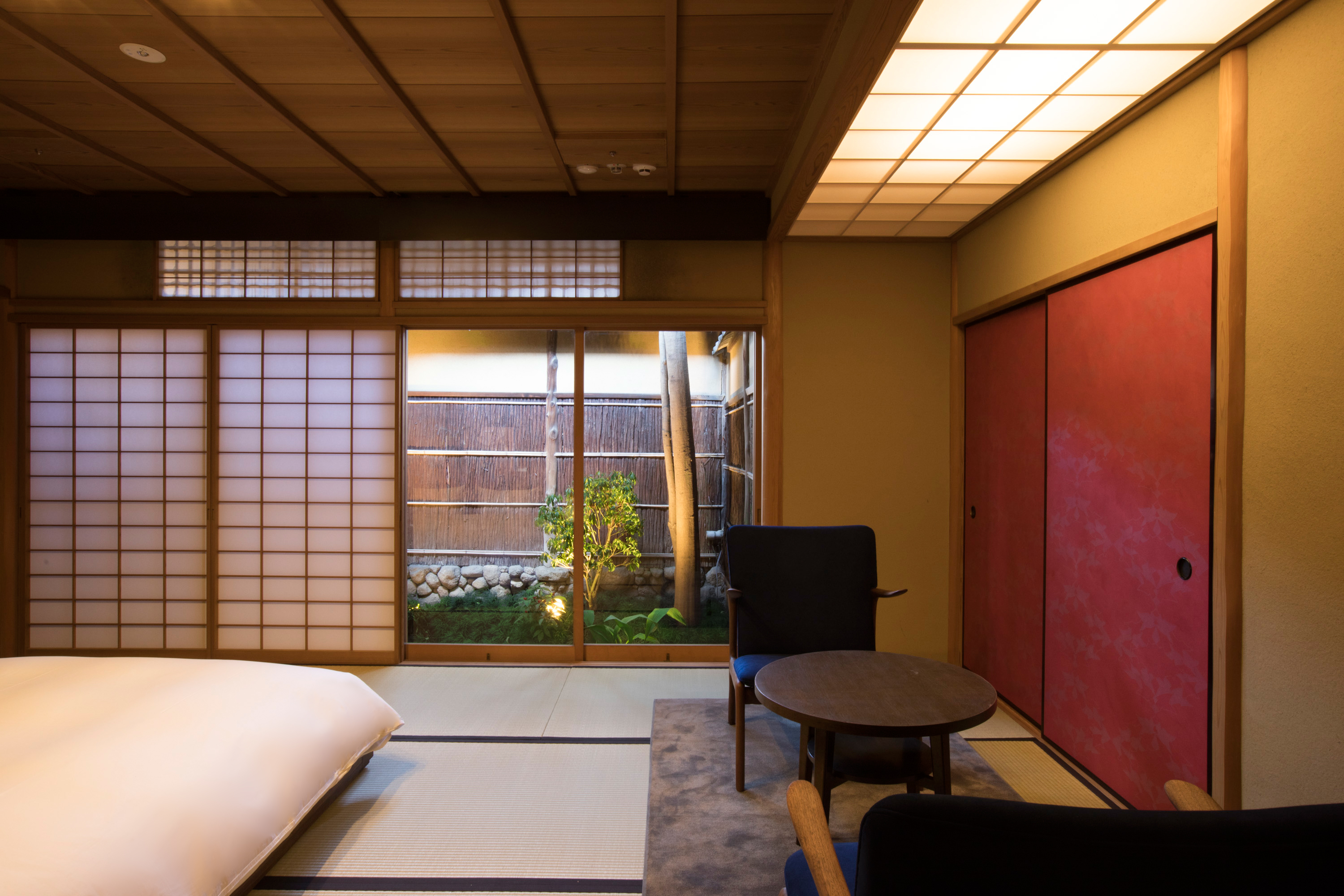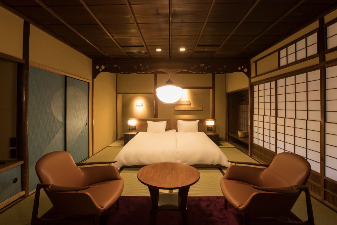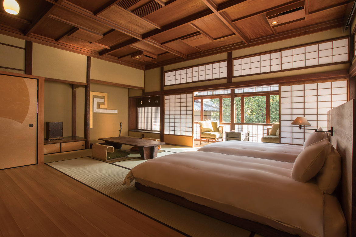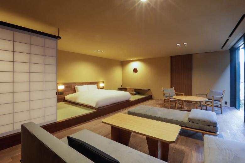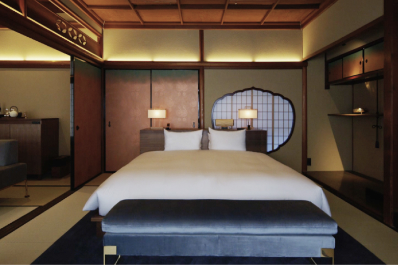 Sowaka’s main building was once a long-established ryotei restaurant constructed in a style closely connected to tea ceremony culture. Carefully renovated, it retains original details such as ceilings crafted from wooden boards arranged in elegant swirling patterns and floors designed with distinctive raised sections that add both texture and warmth to the space. The result is a hotel where the past is not simply preserved but actively lived in and accompanied by contemporary luxuries.