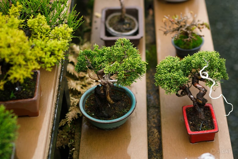 The garden of Bonsai Suishoen, where a variety of bonsai trees from big to small are lined up on display