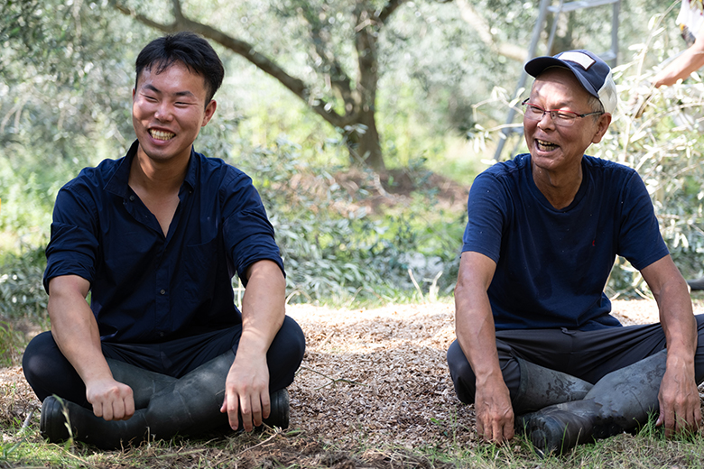 As harvest times for olive trees differ according to variety, the father-and-son owners of Takao Nouen must ensure that they do not miss the optimal harvest time for each. Thus, focusing mainly on Lucca and Mission, the two main varieties grown on Shodoshima, Toyohiro and Kodai meticulously cultivate their olive trees one by one, seemingly having conversations with them.