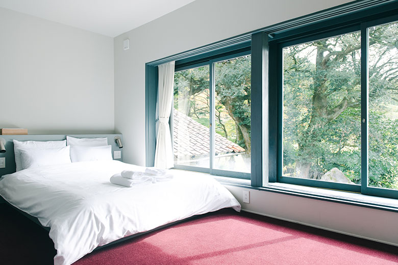 The other accommodation building, Craft & Stay, also has a private guest room on its second floor with one queen-sized bed and one bunk bed. Large windows brighten the room and provide views of surrounding buildings and trees.