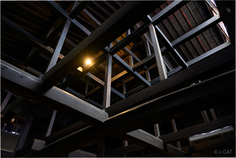 One of the most striking features of the museum is the earthen floor space, which extends up to the third floor. The dynamic structure, supported by heavy beams and tsukabashira (pillars), was carefully reconstructed by master carpenter Jisuke Kawajiri as “show architecture,” preserving the original design after the building was destroyed in the Takayama fire of 1875. This technique, which uses minimal nails, is also seen in the gassho-style houses of Shirakawa-go, a UNESCO World Heritage Site, and exemplifies the essence of Hida’s architectural tradition.