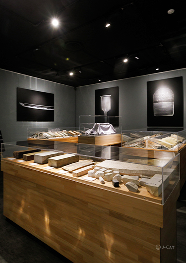 Visitors are greeted at the entrance by an installation evoking a natural whetstone and hone mine, in homage to the prominent role that such mining played in Kameoka’s history. Tanaka begins the tour here with the origins of this industry, dating back not several centuries but millions – 250 million years, to be exact – when sediments began accumulating deep down on the seafloor at a rate sometimes as gradual as a single millimeter per millennium. Eventually, plate tectonics thrust these sediments up to the surface of the present-day Japanese islands and transformed them under the awesome heat of molten granite.