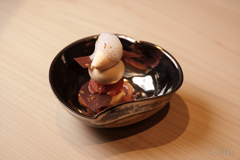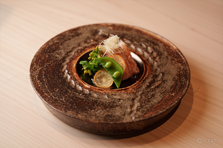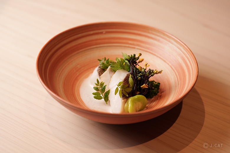 The next dish on this day features spring fish and shellfish from the island of Niigata Prefecture’s Sado Island alongside spring vegetables in a fish bone stock – showcasing the chef’s commitment to wasting nothing. Japan is an archipelagic nation, so island ingredients are commonplace. Delight not only in the food and tableware, but the stories behind them.