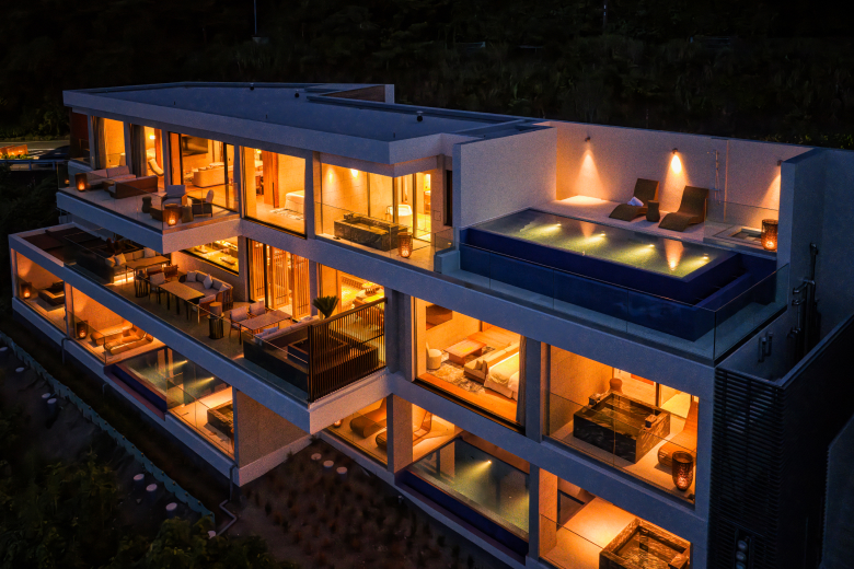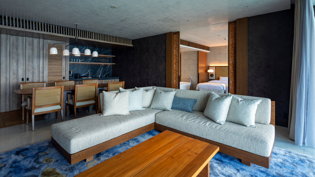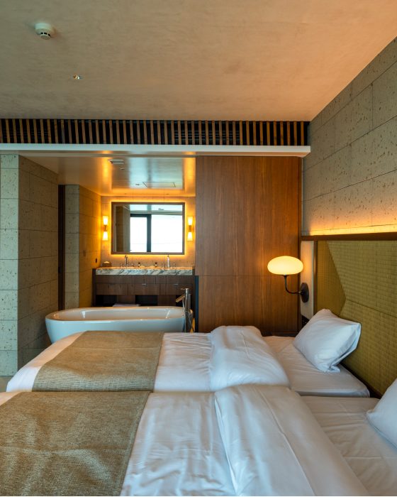 Each two-bedroom suite includes a large central dining area and living room along with 2 bedrooms (one with two single beds and one with a king-sized bed) as well as two bathrooms. On the private balcony is an infinity pool and an onsen bath alongside a terrace with comfortable seating.