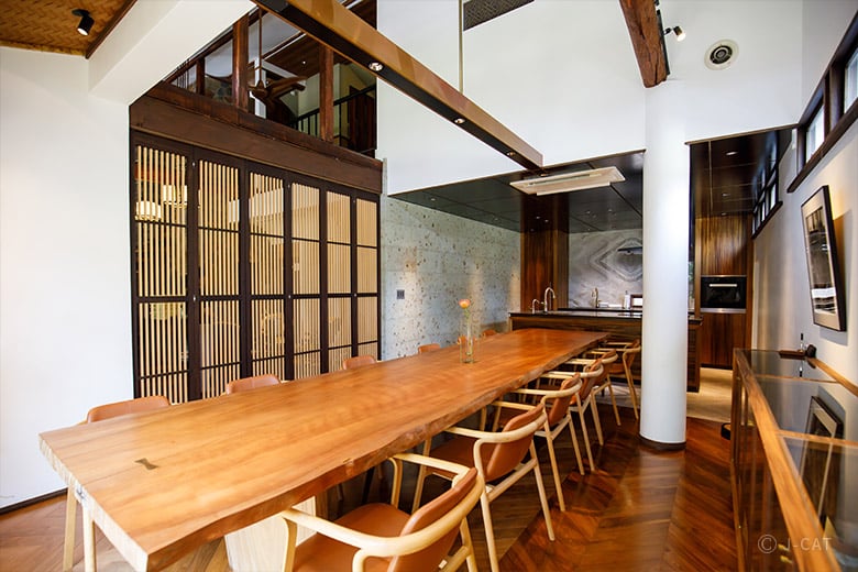 While the villa’s exterior retains its original purely Japanese traditional styling, passing through the front door transports you into an airy high-ceilinged space the likes of which traditional homes never dreamed of. This extraordinary space has been renovated and furnished to the nines, with a hand-selected suite of antique furniture and warm natural construction materials like plaster and stone. Its dining room seats twelve – with room to spare – around a table made from a single slab of wood.